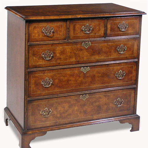 Our functional Chest of Drawers is shown here in myrtle, an exotic wood with intricate grain patterns and warm color. Three 'glove drawers' accent the upper tier, above three roomy full size drawers with 18th century brass handles. Ask us about custom sizes - we will be happy to assist with any of your project needs.