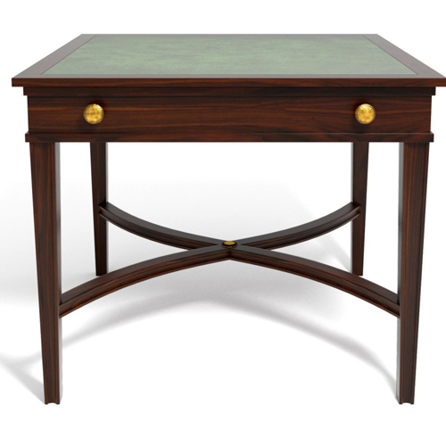 A nice variation on our Modern X-Leg Writing Table, we kept the timeless Regency shapes and produced a useful Game Table. The standard Game Table comes with green leather, but we can change the color or make a wood top. A useful drawer holds all of your game pieces. Also available with different types of hardware.