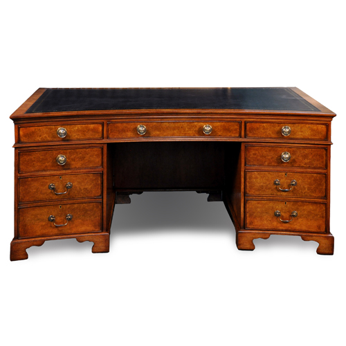 This pedestal desk will add prestige and usefulness to any office design. Standard with file drawers in each pedestal on the seating side, cabinets on the approach side. Customize it with computer-friendly spaces, modesty panel and other productive additions, so that it functions perfectly for any working environment. Shown in warm Burl Walnut.